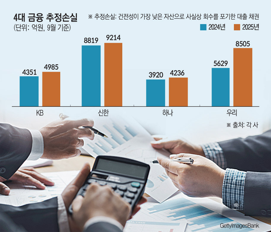 3일 금융권에 따르면 4대 금융(KB·신한·하나·우리)의 9월 말 기준 추정손실 대출채권 규모는 총 2조6940억 원으로 집계됐다. 지난해 같은 기간(2조2720억 원)보다 18.6%(4220억 원) 늘었다. 추정손실은 금융사들이 보유한 대출채권 중 회수 가능성이 극히 낮은 자산을 말한다. 사실상 회수를 포기하고 손실 인식을 염두에 두는 단계다.