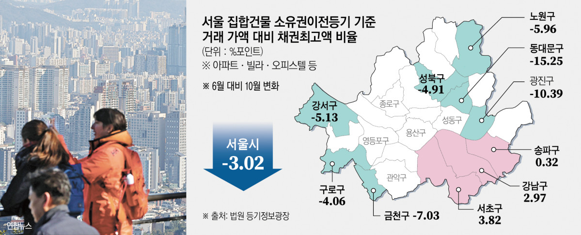 서울 부동산 시장에서 대출을 끼고 집을 사는 거래가 뚜렷하게 줄어든 것으로 나타났다. 6·27 대책과 10·15 대책 등 올해 두 차례에 걸친 정부의 강력한 대출 규제가 시장에 직격탄으로 작용하면서 거래금액 대비 채권최고액 비율이 하락세를 이어갔다는 분석이다. 다만 예외적으로 강남 지역에서는 하반기 들어 채권최고액 비율이 반등하면서 그 배경에 관심이 쏠린다.