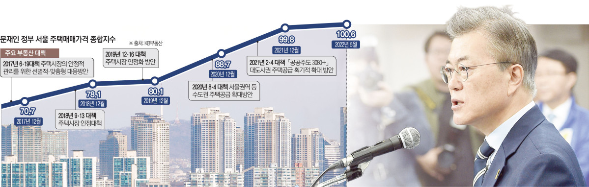 문 대통령이 취임한 2017년은 부동산 과열이 본격화한 해였고, 당시 집값 안정화는 정부가 해결해야 할 가장 중요한 과제였다. 출범 첫해 정부는 6·19 대책을 통해 조정대상지역을 추가 지정하고, 서울 전역 분양권 전매금지에 나섰다. 이어 8·2 대책에선 서울 대부분 지역을 투기지역·투기과열지구로 묶었고 한 달 만에 9·5 대책을 통해 성남 분당과 대구 수성구를 투기과열지구로 추가 지정했다. 이듬해인 2018년에는 6월 종합부동산세 개편안도 내놨지만 집값은 좀처럼 잡히지 않았다.