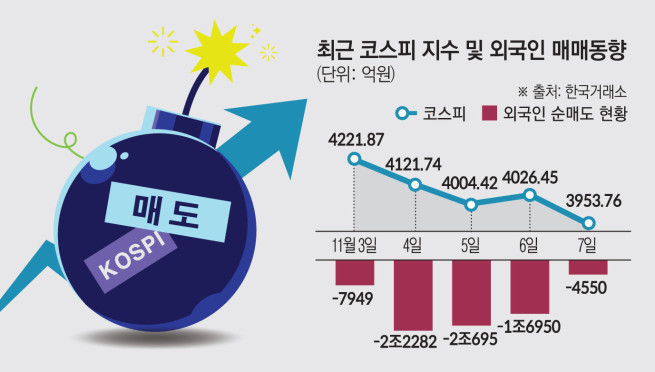 코스피, 4000선 붕괴…외국인 한주 새 7.2조 ‘역대급 탈출’