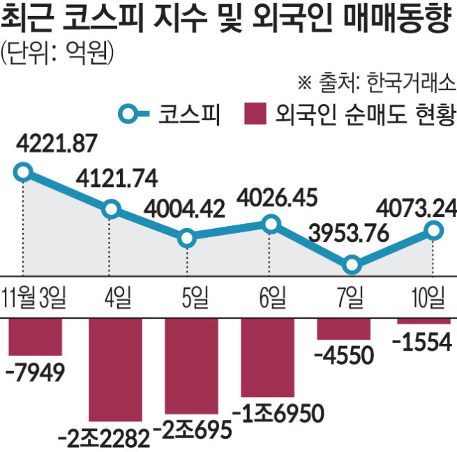 코스피가 하루 만에 3% 넘게 오르며 4000선을 회복했다. 미국 연방정부 셧다운(일부 기능 정지) 해제 기대감과 정부의 배당소득세 완화 추진이라는 정책·대외 훈풍이 동시에 불며 급락장 이후 위축됐던 투자심리가 빠르게 되살아났다. 지난주 7조 원 넘게 쏟아졌던 외국인 매도가 진정세를 보였고, 기관의 대규모 순매수가 지수 반등의 동력이 됐다.