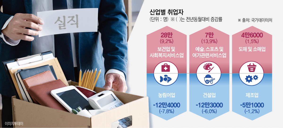 반면 도매 및 소매업 취업자는 4만6000명 늘면서 2017년 11월(4만6000명) 이후 가장 큰 폭의 증가세를 기록했다. 보건업 및 사회복지 서비스업(28만 명), 예술 스포츠 및 여가 관련 서비스업(7만 명) 등도 취업자 수가 늘면서 증가세가 두드러졌다.