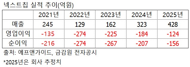 이처럼 대규모 자금 조달에 나선 배경에는 심각한 재무구조 악화가 있다. 앤씨앤의 오토모티브 사업부가 물적분할돼 2022년 상장한 넥스트칩은 외형 성장을 이루고 있으나 매년 수백억 원의 적자를 기록해 왔다. 그 결과 반기 말 현재 자본잠식률이 118.6%를 기록하며 완전 자본잠식 상태에 빠졌다. 이로 인해 코스닥시장본부는 넥스트칩을 투자주의환기종목으로 지정했다. 회사는 6월에도 공모 유상증자를 시도했으나 목표 금액(395억 원) 대비 76억 원 조달에 그쳐 300억 원 규모의 CB 상환 재원 마련에 실패하면서 이번 유증을 추진하게 됐다.