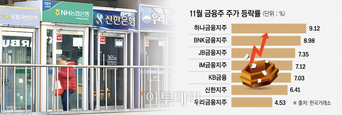 30일 한국거래소에 따르면 ‘KRX 은행 지수’는 11월 들어 5.89% 상승했다. 전체 KRX 지수 중 상승률 3위에 해당하는 기록이다. 같은 기간 종목별로는 하나금융지주(9.12%), BNK금융지주(8.98%), JB금융지주(7.35%), iM금융지주(7.12%), KB금융(7.03%), 신한지주(6.41%), 우리금융지주(4.53%) 등의 상승 폭이 두드러졌다.