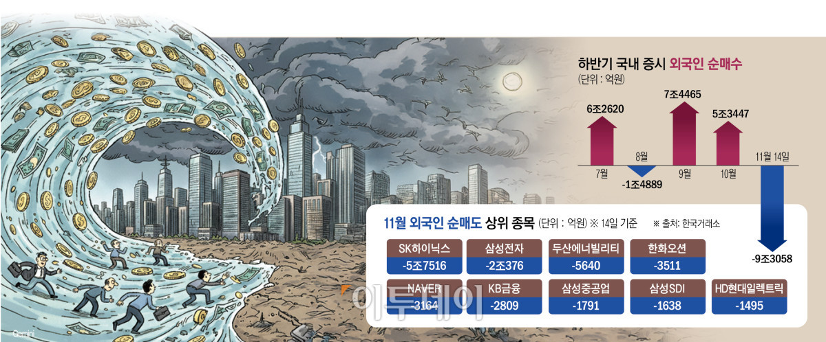 올해 9~10월 국내 증시에서 대규모 매수세를 이어가던 외국인 투자자가 이달 들어 9조 원이 넘는 물량을 던지고 있다.