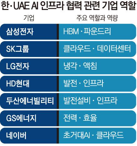 에너지·인프라 기업들도 데이터센터 확장과 맞물리며 협력 범위가 넓어질 전망이다. HD현대·GS에너지·두산에너빌리티 등은 발전·송전·냉각 인프라 구축 경험을 바탕으로 UAE의 대규모 AI 산업단지 사업에 참여할 것으로 관측된다.