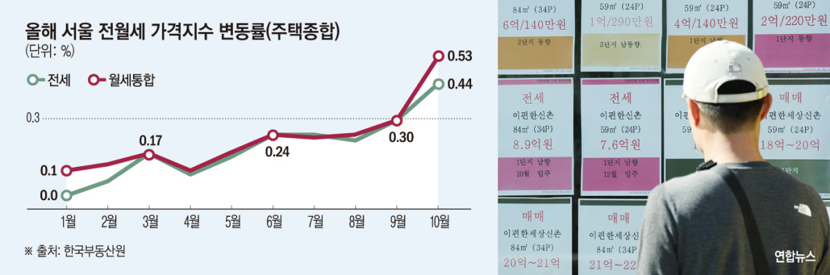 18일 한국부동산원 통계에 따르면 지난달 서울 전세가격지수(주택종합)는 전월보다 0.44% 증가해 올해 들어 최고 상승률을 경신했다. 이처럼 전세 공급이 줄고 이로 인해 매물이 감소할 것이란 우려가 확산하면서 월세 가격도 밀어 올리고 있다. 같은 기간 서울 월세 통합 가격지수 상승률은 0.53%로, 이 역시 올해 들어 최고 수준이다.