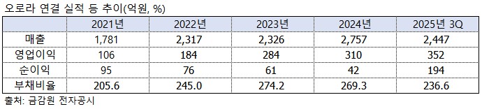 문제는 급증한 이자비용이다. 오로라는 2000억 원대 매출에서 10% 안팎의 영업이익을 올리면서도 순이익은 최근 3년 연속 80억 원이 되지 않았는데 주요 원인으로 이자비용이 지목된다. 이자비용은 2022년 78억 원에서 2023년 153억 원, 작년에는 179억 원으로 가파르게 증가했다.