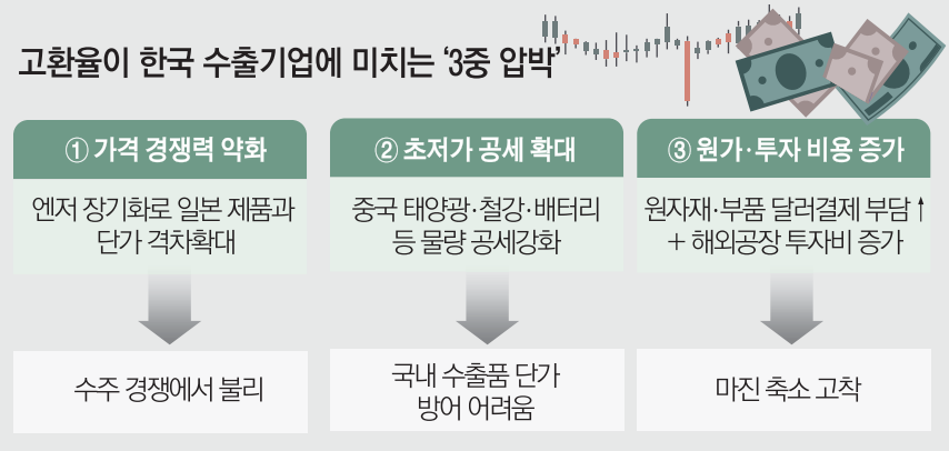 이 같은 경쟁 압박 속에서 국내 기업의 원가 부담은 고환율로 더 커지고 있다. 달러로 결제되는 원자재·부품 가격이 치솟으며 수출 마진이 빠르게 악화하는 악순환이 반복되고 있다. 수출 기업 관계자는 “판매가격을 올리고 싶어도 일본·중국 업체가 버티고 있어 단가 인상이 사실상 불가능하다”며 “환율이 올라가도 남는 게 없는 상황”이라고 말했다.