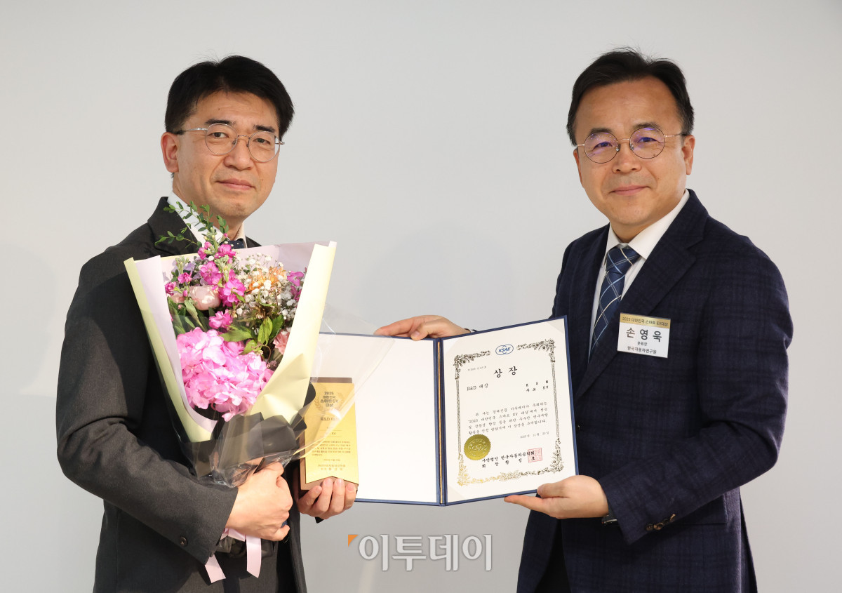 20일 서울 강남구 논현동 이투데이 본사에서 열린 2025 대한민국 스마트 EV대상에서 KGM 무쏘 EV가 대상 한국자동차공학회장상(R&D부문)을 수상했다. 수상자인 한종희(왼쪽) KGM 상무가 시상자 손영욱 한국자동차연구원 분원장과 기념촬영을 하고 있다. 올해로 5회째를 맞은 행사의 시승 평가는 지난달 18일 한국교통안전공단 자동차안전연구원에서 열렸다. 한국자동차공학회가 추천한 자동차공학계 석학 9인으로 구성된 평가위원단을 필두로 전기차의 성능과 경쟁력을 종합적으로 평가했다. 고이란 기자 photoeran@