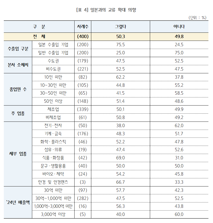 최근 한일 정상회담, 셔틀 외교 재개 등 한일 관계 개선을 계기로 향후 일본과의 교류 확대 의향에 대해 응답 기업의 50.3%는 ‘확대 의향이 있다’고 답했다. ‘확대 의향이 없다’고 응답한 기업은 49.7%였다.