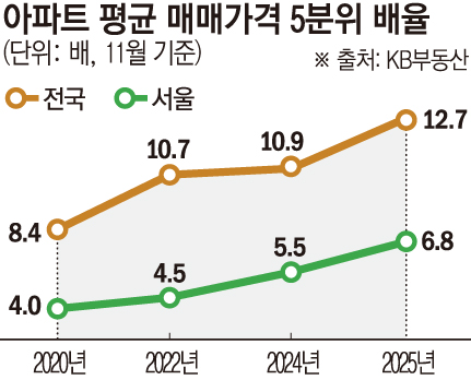 25일 KB부동산에 따르면 전국 아파트 평균 매매가격 5분위 배율은 지난달 12.5배에서 이달 12.7배로 커졌다. 관련 통계 작성 이래 최대치를 다시 경신한 것이다.