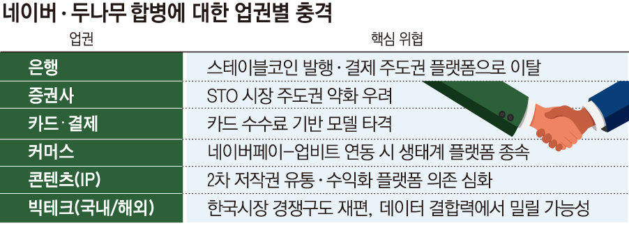증권업계의 충격은 더 깊다. 증권형 토큰발행(STO) 시장은 사실상 증권사들이 미래 먹거리로 점찍고 수년간 대비해온 핵심 분야다. 하지만 네이버파이낸셜-두나무 결합이 현실화하면 STO생태계 초입부터 플랫폼이 이용자, 트래픽, 브랜딩을 독식할 수 있다는 우려가 크다. 강 교수는 “현재 규제상 암호화폐 거래소에서 삼성전자 주식이나 국채 같은 토큰화 자산을 거래하는 것은 불가능하다”며 “하지만 STO를 취급하기 위한 별도 거래소가 신설될 가능성이 크고, 그 경우 업비트와 별개라도 네이버 생태계가 STO 수요를 빨아들일 수 있어 증권사들이 가격, 유동성, 이용자 기반에서 밀릴 수 있다”고 했다.