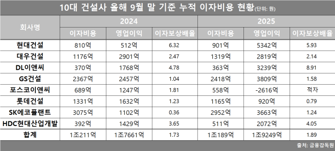 2일 금융감독원 전자공시시스템에 따르면 건설부문 재무지표가 공시되지 않는 삼성물산을 제외한 10대 건설사의 올해 9월 말 기준 누적 이자비용 총합은 1조189억 원으로 집계됐다. 이는 지난해 같은 기간(1조211억 원) 대비 0.2% 감소한 수치다. 이에 따라 평균 이자보상배율은 1.73배에서 1.89배로 개선됐다.