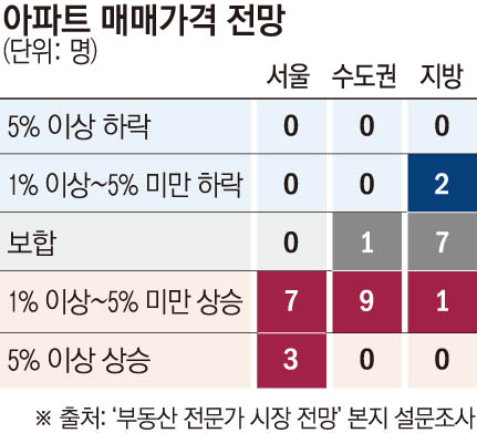 반면 지방은 온도 차가 뚜렷하다. 보합을 예상한 전문가가 7명으로 가장 많다. 1명은 소폭 상승(1~5%미만), 2명은 소폭 하락(1~5% 미만)을 예측했다.