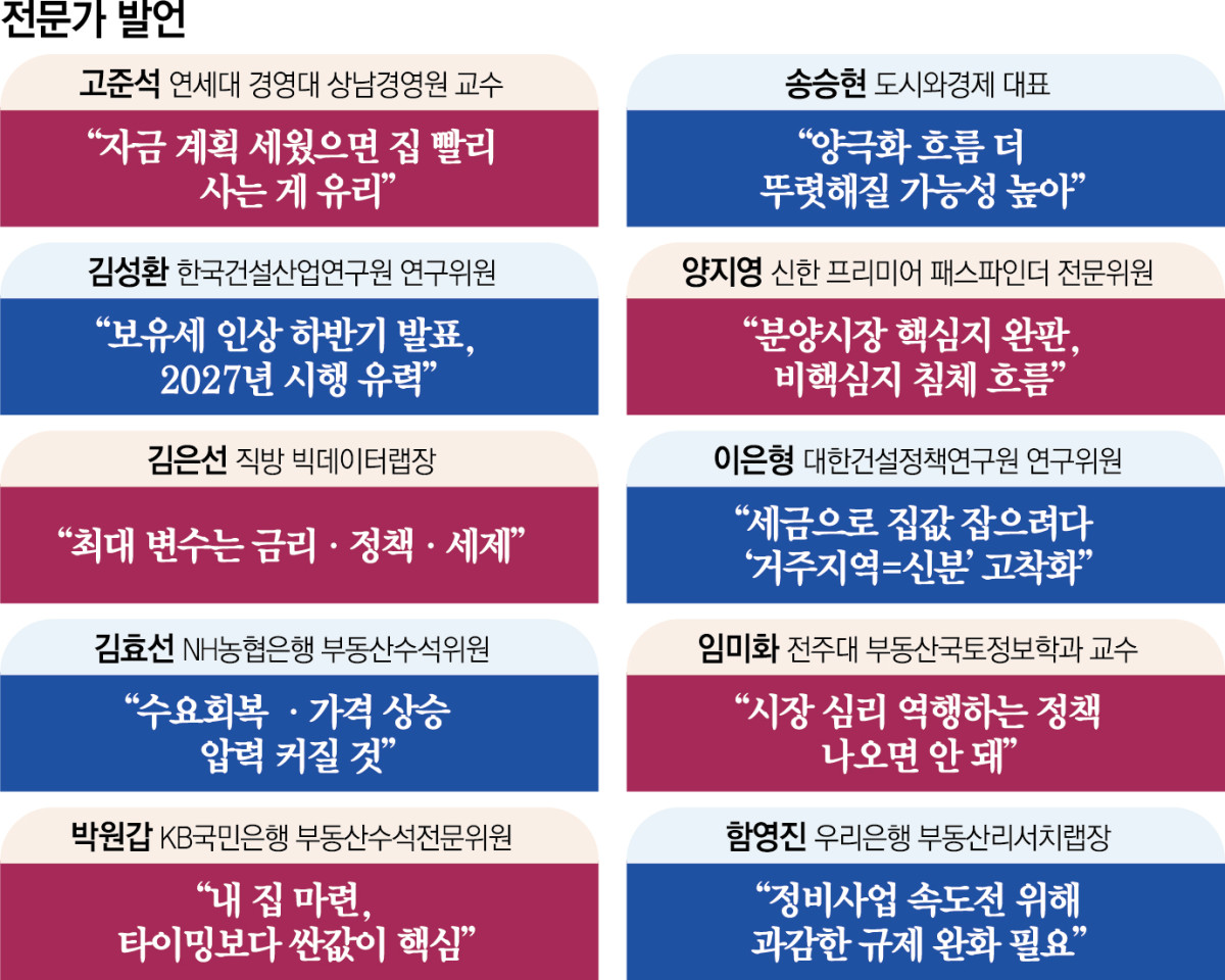 정부의 정책 방향은 거래 정상화에 맞춰야 한다는 견해가 많았다. 송승현 도시와경제 대표 "과도한 규제가 누적돼 거래가 멈춘 상황에서는 주택담보인정비율(LTV)·총부채상환비율(DTI) 현실화, 취득세 중과 완화, 양도세 유연화 등 정상적 매매 흐름을 회복시키는 조치가 필수"라며 "거래가 살아야 가격 왜곡이 줄고 실수요 이동도 원활해진다"고 설명했다.