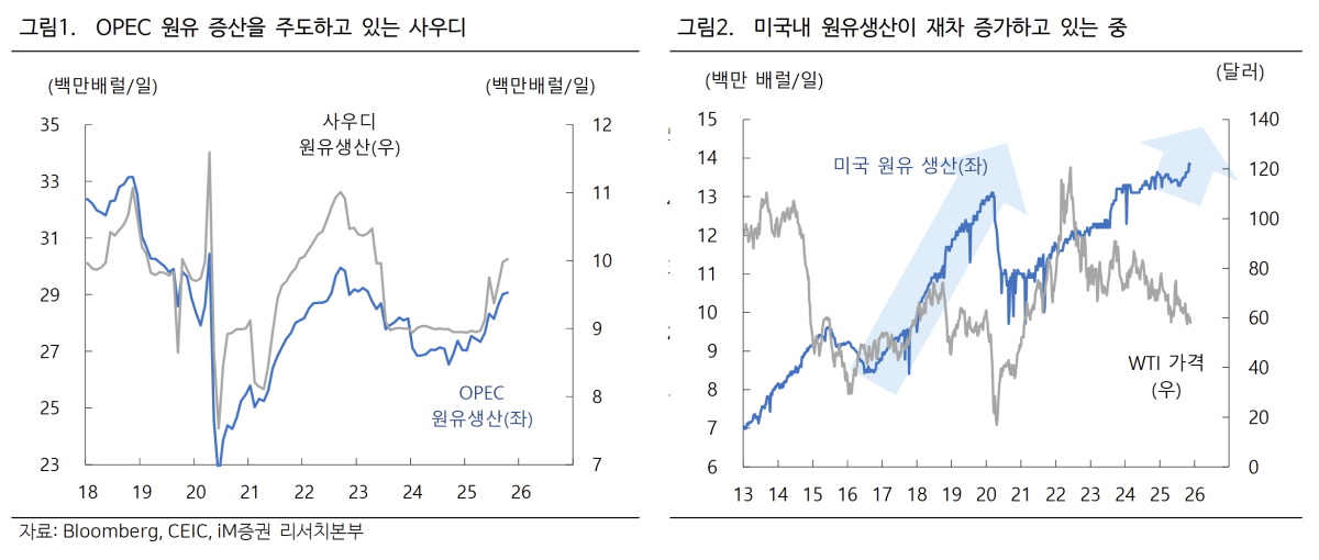 iM증권은 27일 석유수출국기구(OPEC) 및 미국 원유생산 확대에 따른 원유시장 과잉공급과 러-우 종전 기대감에 국제 유가 추가 하락 압력 높아지고 있다고 전망했다. 미국 에너지청(EIA)이 2026년 국제유가(WTI 기준) 평균 50달러 초반 수준으로 내다본 점도 주목했다.
