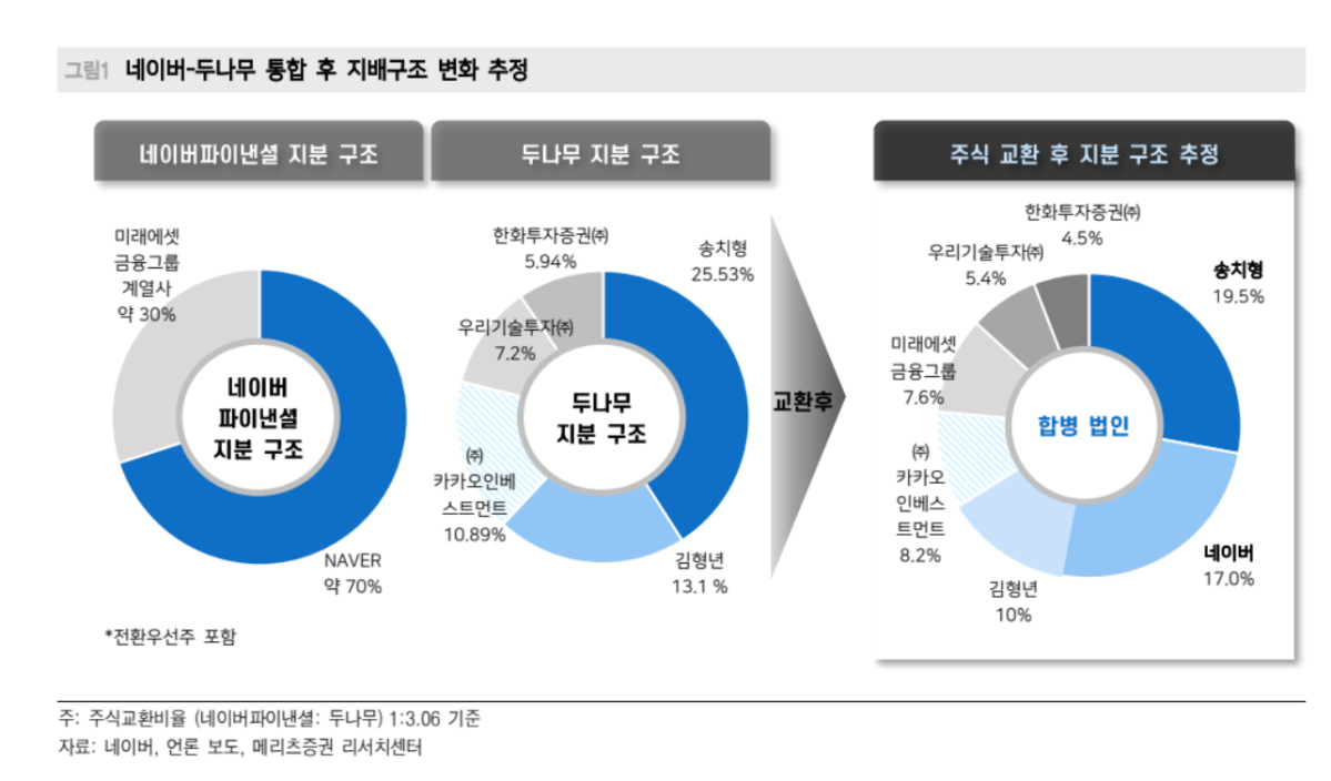 이효진 메리츠증권 연구원은 “26일 양사가 이사회에서 네이버파이낸셜과 두나무의 합병을 1대 2.54의 주식교환비율로 결의했다”며 “네이버는 합병 후 지분 17%에 더해 송치형 두나무 회장과 김형년 부회장의 의결권을 위임받아 46.5%의 지배력을 확보할 전망”이라고 밝혔다.