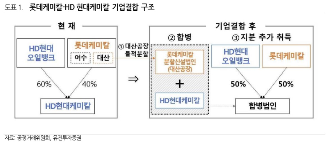 황성현 유진투자증권 연구원은 대산공장 통합 구조에 대해 “롯데케미칼 대산 공장을 물적분할한 뒤 HD현대케미칼과 합병해 50:50 통합법인을 설립하는 형태”라며 “산업부 승인 직후 설비가 즉각 가동 중단되는 것은 아니고, 통합법인 출범 이후 단계적으로 포트폴리오 리밸런싱이 이뤄질 것”이라고 밝혔다.