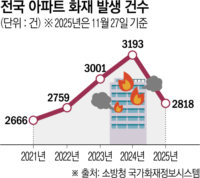 공동주택 중에서도 특히 아파트 화재는 매년 증가세다. △2021년 2666건 △2022년 2759건 △2023년 3001건 △2024년 3193건으로 집계됐으며, 올해도 이날까지 기준 2818건이 발생해 이 추세라면 연말까지 3000건을 넘어설 것으로 관측된다.