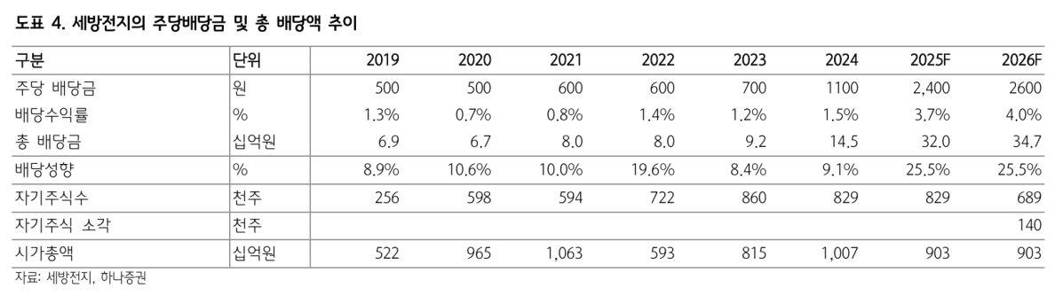 주주환원 정책도 강화된다. 세방전지는 배당성향을 기존보다 높인 25%로 상향해 유지할 방침이며, 자사주 1%(14만 주)를 소각하기로 결정했다.
