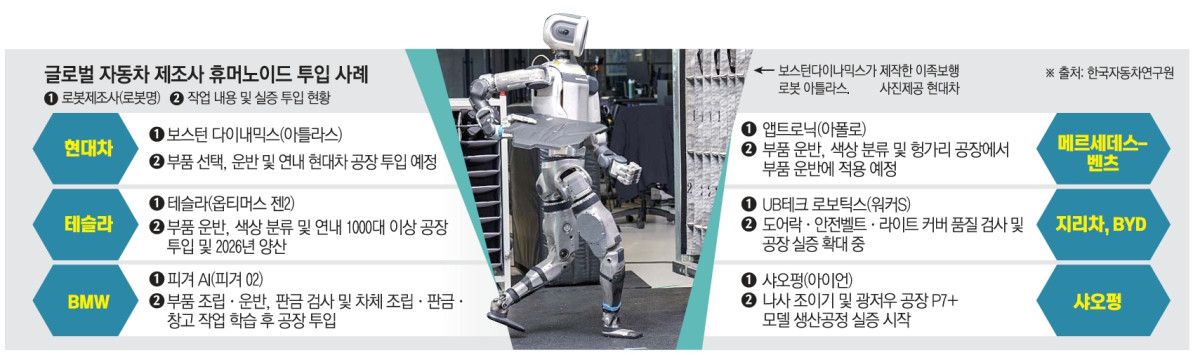 1일 한국자동차연구원에 따르면 최신 휴머노이드 로봇은 최대 25㎏의 가반하중, 4~20시간의 작업 지속시간, 손 자유도 11~22단계를 구현하며 사람 수준의 조립·검사 작업까지 수행할 정도로 성능이 향상됐다. UB테크, 피겨 AI, 테슬라 등이 공장 실증을 본격화하면서 적용 범위는 빠르게 넓어지고 있다.