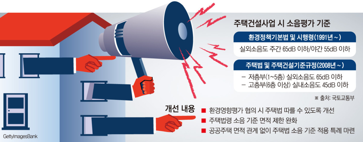 환경법령은 층수와 무관하게 실외 소음(주간 65dB·야간 55dB 미만)만 평가하지만, 주택법령은 6층 이상 고층일 경우 실외 소음은 평가 대상이 아니다. 주택법에선 공동주택 1∼5층의 저층부는 실외 소음도(65dB 미만)를, 6층 이상의 고층부는 실내 소음도(45dB 미만)만 평가하기 때문이다.