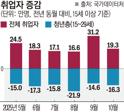 30일 국가데이터처의 '10월 고용동향'에 따르면 10월 취업자 수는 1년 전보다 19만3000명 증가하며 20만 명 수준의 안정적인 흐름을 보였다. 그러나 세부적으로 살펴보면 곳곳에 비상신호가 감지된다. 고령층인 60세 이상(33만4000명)과 30대(8만 명)에서 취업자가 늘었지만 나머지 연령대에서 모두 감소했다. 특히 청년층(15~29세)은 지난해 같은 달보다 16만3000명 줄어들며 가장 큰 감소 폭을 보였다.