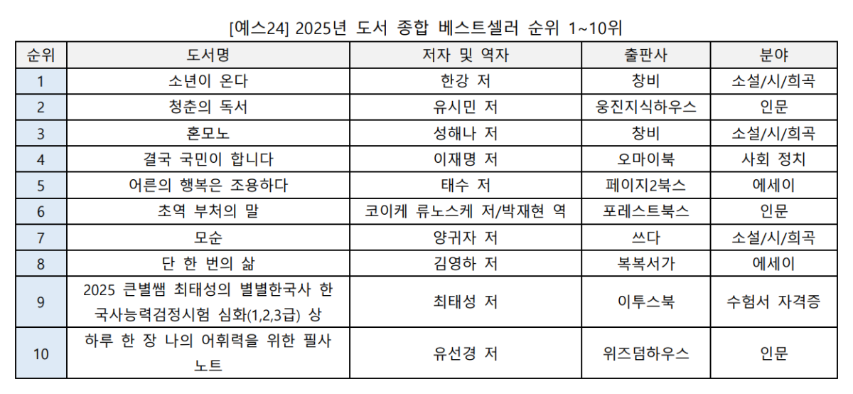 1일 예스24 등 주요 서점에 따르면, 올해 종합 베스트셀러 1위에 5·18 민주화운동을 다룬 한강의 '소년이 온다'가 올랐다. 이 책은 올해에만 27주간 종합 10위 내에 자리했다. 지난해에 이어 2년 연속 종합 1위다.