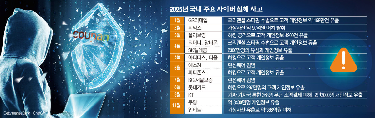 1일 보안업계에 따르면 공공, 금융, 플랫폼 등 업종을 가리지 않고 초대형 개인정보 유출 사고가 터졌다. SK텔레콤(2300만 명 유심 정보 유출), 롯데카드(CVC 유출), KT(가짜 기지국 피해), 정부 온나라시스템(공무원 정보 유출), 업비트(386억 원 피해), 쿠팡(3370만 명 개인정보 유출) 등 주요 기관과 기업들이 연이어 피해를 입으며 국내 보안 시스템의 근본적인 취약성이 드러났다.