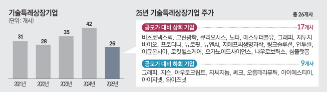 1일 본지가 올해 코스닥 기술특례 상장 기업 26개 사를 전수 분석한 결과 현재 주가가 공모가를 웃도는 종목은 17개 사(약 65%)로 집계됐다.