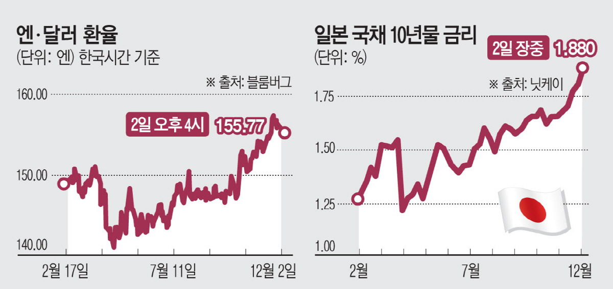 엔·달러 환율은 2일까지 4거래일 연속 엔화가 절상 흐름을 보이며 155엔대까지 내려왔다. 코페이의 칼 샤모타 수석 시장 전략가는 “일본은행의 정책 긴축 신호가 글로벌 금리를 끌어올리고 달러 매력을 떨어뜨리면서 금융시장이 12월을 난기류 속에서 출발하고 있다”며 “엔화가 달러 대비 강세를 보이고 있다”고 설명했다.