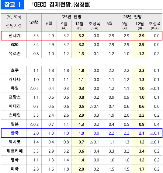 한편 OECD는 세계 경제가 종전 전망과 같은 올해 3.2%, 내년 2.9% 성장할 것으로 전망했다. OECD는 "올해 세계 경제가 무역장벽 강화와 정책 불확실성에 따른 경기 둔화 우려에도 예상보다 강한 회복력을 보였지만 근본적인 취약성이 여전히 남아있다"고 평가했다.
