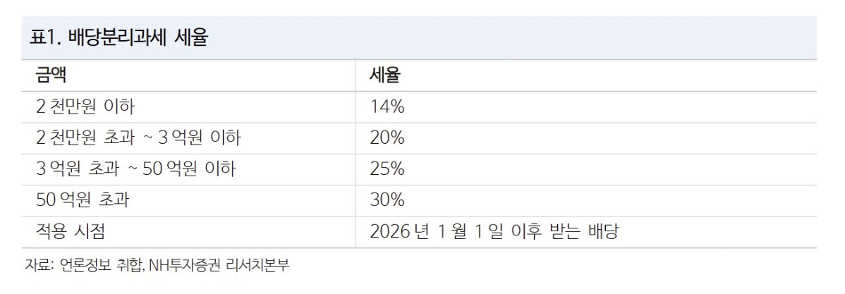 NH투자증권은 3일 배당소득 분리과세 법안이 국회를 통과함에 따라 고배당 기업에 대한 투자 선호가 더욱 높아질 것으로 분석했다.