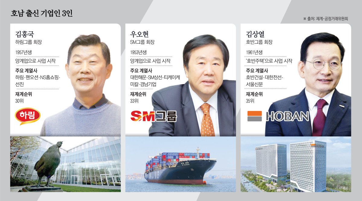 하림·SM·호반그룹이 잇따른 대형 인수합병(M&A) 전선에서 서로에게 힘을 실어주며 재계의 새로운 연대 축으로 떠오르고 있다. 김홍국 하림그룹 회장, 우오현 SM그룹 회장, 김상열 호반그룹 회장이 사업 확장 국면마다 '파트너ㆍ경쟁자ㆍ지원군'을 오가며 형성한 이른바 '호남동맹'이 해운ㆍ건설ㆍ미디어 산업의 판도를 뒤흔들고 있다는 분석이다.