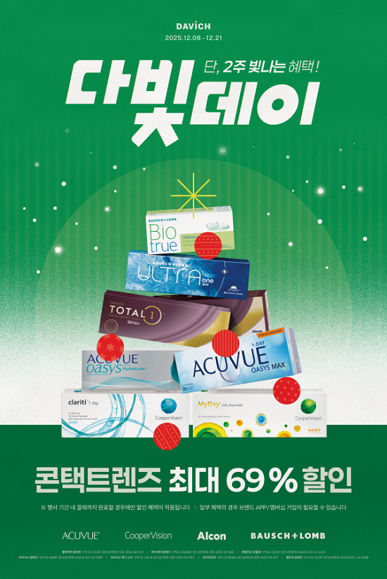 시력 교정 전문 브랜드 다비치안경이 12월 8일부터 21일까지 단 2주 동안 콘택트렌즈를 최대 69% 할인하는 프로모션 다빛데이를 진행한다.