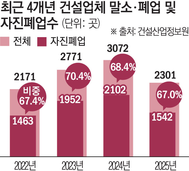 최근 건설사 폐업 증가세는 뚜렷하다. 2022년 2171곳이던 폐업·말소 건설사는 2023년 2771곳으로 28%가량 늘었고 지난해에는 3072곳으로 2016년(3164곳) 이후 8년 만에 3000곳을 넘겼다. 현재 분기별 폐업 속도를 감안할 때 올해도 3000곳 이상이 퇴장할 가능성이 크다.