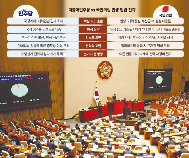 국민의힘 내부에서는 “당이 민생과 개혁을 앞세워야 한다”는 쇄신론과 “정부·민주당 국정 실패를 정면으로 공격해야 한다”는 강경론이 충돌하는 분위기다. 10·15 부동산 대책을 두고 여당 전체가 강하게 몰아붙이면서도 민심 이반이라는 부메랑을 우려해 지도부는 메시지 수위를 조율 중이다. 민주당 역시 국정과제 입법 드라이브에 집중하고 있으나, 부동산 정책 불신·경제 부담·고금리 장기화 속에서 “민생 체감 성과가 없다”는 지적이 잇따르고 있다.