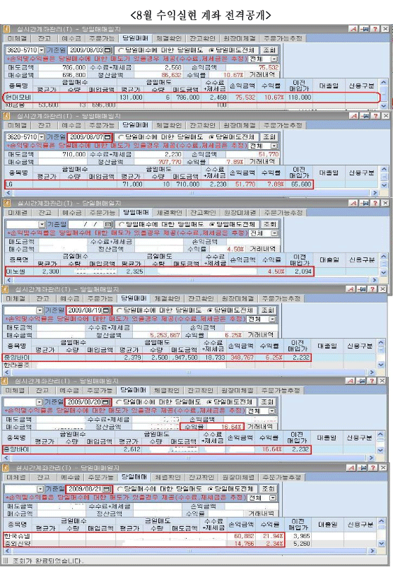 실례로 7월과 8월 수익종목으로 삼성SDI 23%, LG화학 28%, 파워로직스 19%, 넥스콘테크 23%, 현대차 17%, 기아차 7%, 현대모비스 17%, 하이닉스 19%, .등 블루칩의 종목구성으로 수익과 안정성이라는 두 마리 토끼를 잡을 수 있는 최영동 대표의 실력을 입증했다.