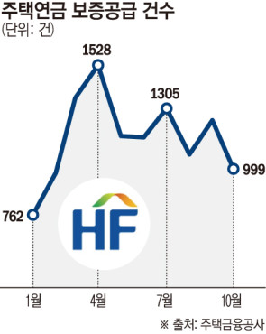 8일 한국주택금융공사에 따르면 10월 신규 주택연금 보증공급(신규)은 999건으로 집계됐다. 전월 대비 19.69% 감소한 수치다. 보증공급이 1000건 아래로 내려간 것은 2월(979건) 이후 처음이다.