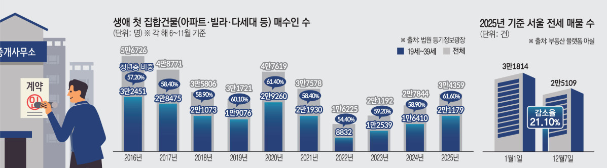 8일 법원 등기정보광장에 따르면 올해 첫 대출규제가 시행된 6월부터 11월까지 서울에서 생애 최초로 집합건물(아파트·빌라·다세대 등)을 취득한 19~39세 청년은 2만1179명으로 집계됐다. 같은 기간 전체 생애 최초 매수인(3만4359명) 가운데 이들이 차지한 비중은 61.6%로, 관련 통계가 나온 2010년 이후 같은 기간 기준 가장 높은 수치다.