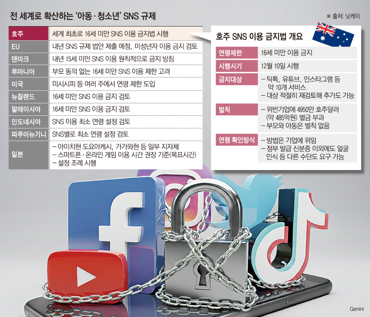호주가 틱톡, 인스타그램 등 주요 사회관계망서비스(SNS)의 16세 미만 청소년 이용을 전면 금지하는 초강수 조치를 발표하면서 전 세계적으로 파장이 일고 있다. 전문가들은 아동·청소년 보호를 위한 강력한 규제가 다른 주요 국가들로 빠르게 확산되는 도화선이 될 것이라 전망하며, 관련 산업의 구조적 변화를 예고했다.
