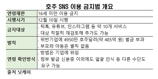 관련 법은 플랫폼 규제가 핵심이다. 청소년의 SNS 계정을 차단하기 위해 합리적인 조처를 하지 않으면 규제한다. 최대 4950만 호주 달러(약 485억 원)의 벌금도 부과할 수 있다. 단, 이용자와 이용자의 부모는 처벌 대상에서 제외했다.