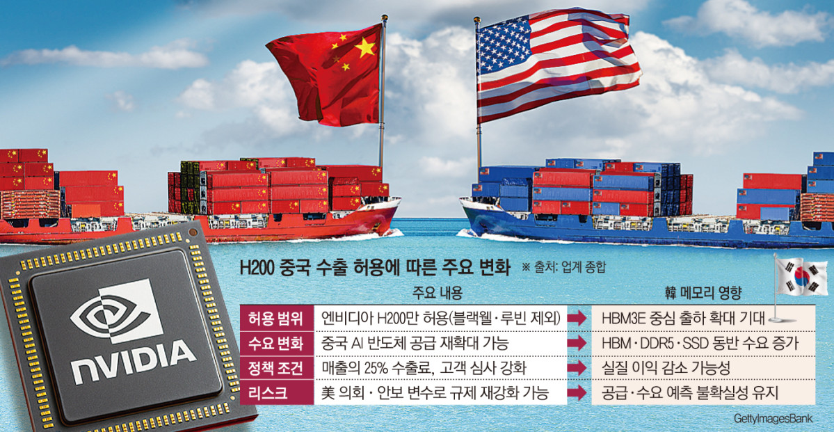 AI 경쟁의 핵심은 GPU와 이를 뒷받침하는 HBM·DDR5·AI 서버 D램 등 메모리 반도체다. 미국은 AI 초거대 모델 시대의 뒤판을 장악하기 위해 최첨단 GPU의 중국 유입을 원천 차단하면서도, 미국 기업의 매출 감소를 완충하기 위해 중간 단계의 칩은 ‘조건부 허용’으로 조정하는 투트랙 전략을 취하고 있다.