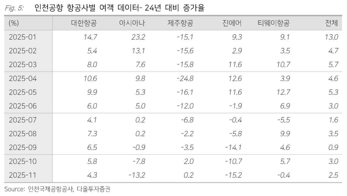 오정하 다올투자증권 연구원은 “연휴 효과가 없는 비수기 11월에도 인천공항을 포함한 국내 공항의 여객 흐름이 뚜렷하게 유지되고 있다”며 “특히 중국·일본 등 근거리 노선 강세와 미국 노선 회복세가 분명하게 나타나고 있다”고 설명했다.