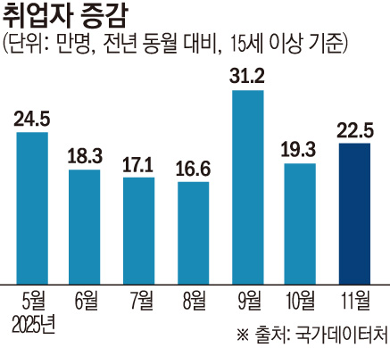 11월 취업자 수가 1년 전보다 22만 명 넘게 증가했다. 이에 따라 취업자 수가 10월과 11월 두 달 연속 20만 명 안팎의 증가 폭을 보이며 고용 개선 흐름을 이어갔다. 다만 건설·제조업 취업자는 1년 넘게 감소 흐름에서 벗어나지 못했고, 청년층 고용 악화도 지속했다.