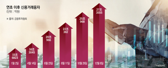 10일 금융투자협회에 따르면 8일 기준 신용거래융자는 27조3555억 원을 기록했다. 연초 대비(15조6823억 원) 대비 약 74% 급증한 규모다. 신용거래융자는 올해 6월 들어 20조 원 선을 넘어선 뒤 꾸준히 늘어 최근 사상 처음으로 27조 원을 돌파했다.