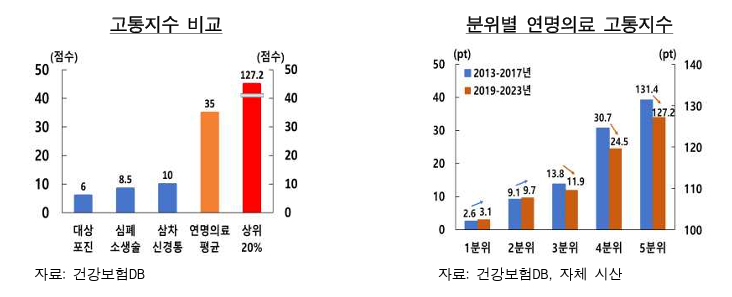 무의미한 연명의료 지속은 환자에게 극심한 신체적 고통을 안긴다. 연구진이 산출한 '연명의료 고통지수'에 따르면, 연명의료 환자가 겪는 평균 고통은 대상포진 등 단일 질환에서 겪는 최대 통증의 약 3.5배에 달했다. 특히 고통지수 상위 20% 환자의 경우 그 강도가 12.7배에 이르는 것으로 나타났다.