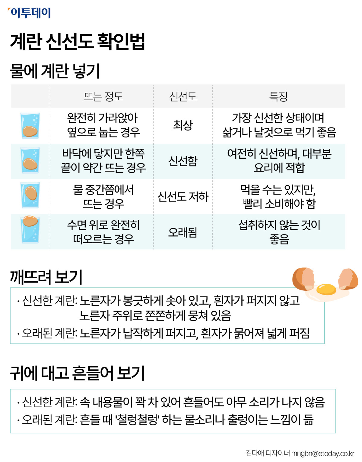 · 신선한 계란: 속 내용물이 꽉 차 있어 흔들어도 아무 소리가 나지 않음