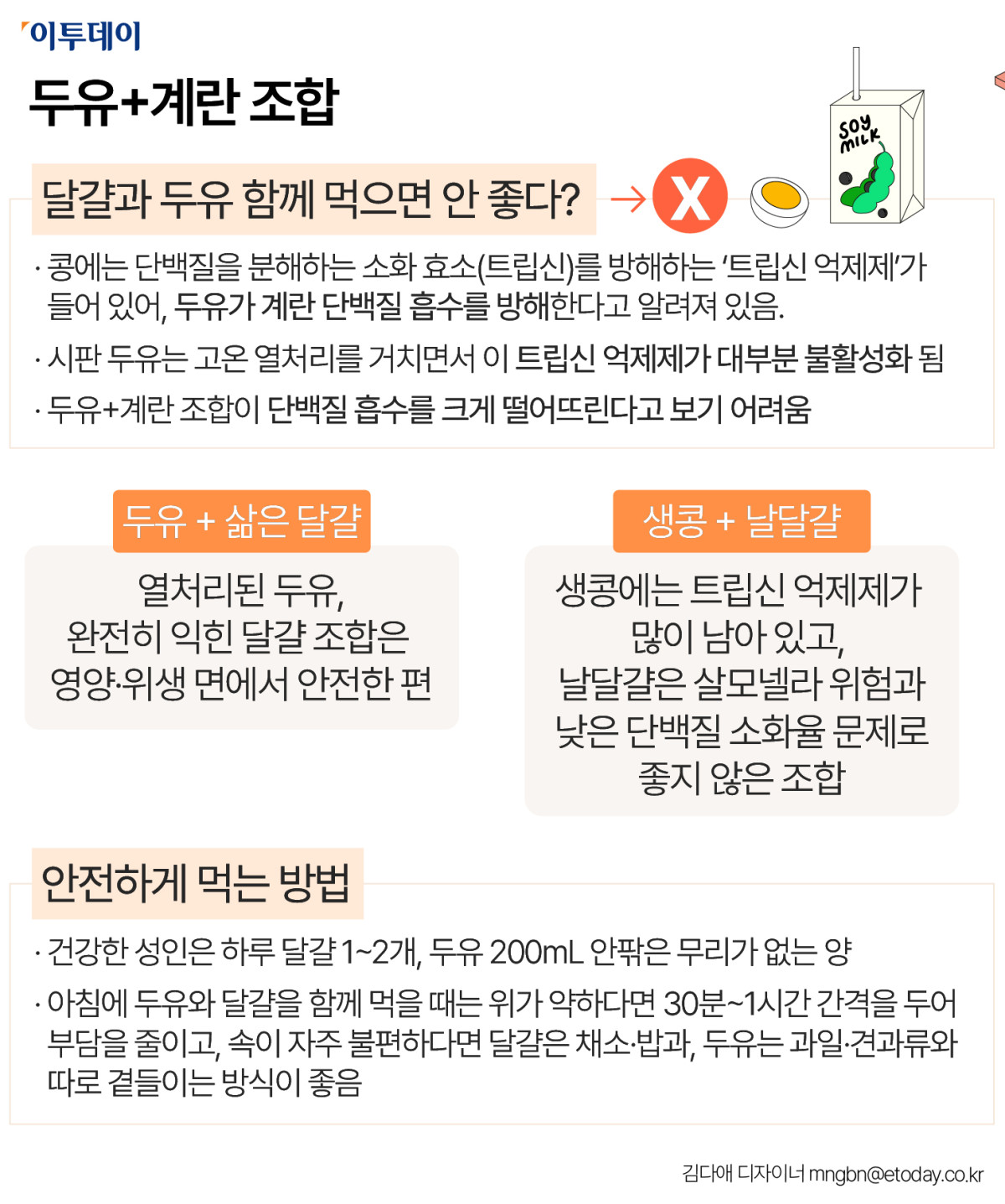 따라서 열처리된 두유와 완전히 익힌 달걀 조합은 영양·위생 면에서 안전한 편이다. 그러나 생콩과 날달걀 조합은 좋지 않다. 생콩에는 트립신 억제제가 많이 남아 있고, 날달걀은 살모넬라 위험과 낮은 단백질 소화율 문제가 있어 함께 먹기에 좋지 않다.
